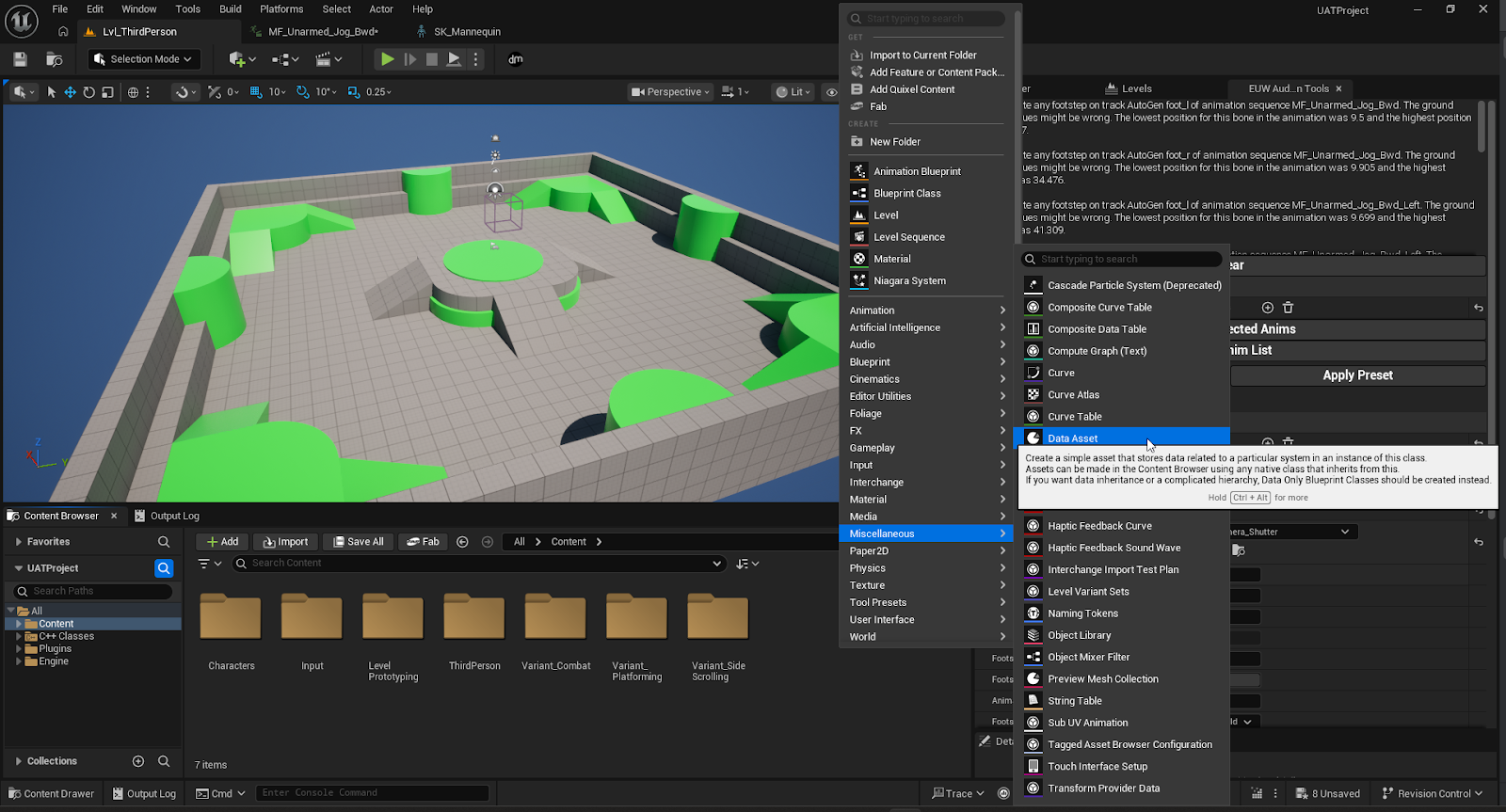 Because animation files for the same character will probably use the same bone names and sound events, you can create Preset data assets that will store these values in an Unreal Asset.