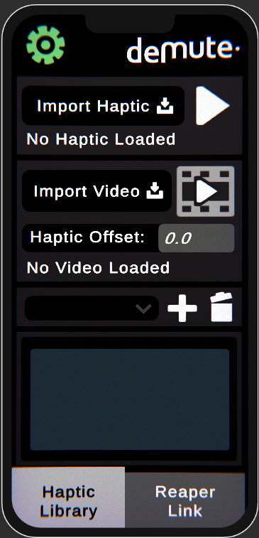 To load rendered files in the ReahapticReceiver app go to the Haptic Library tab. There you can Import a haptic file(supports .haptic and .haps) with the Import Haptic button and play it with the play icon. You can also import a refference video with the Import video button and set at what time the haptic should play with the Haptic Offset parameter.