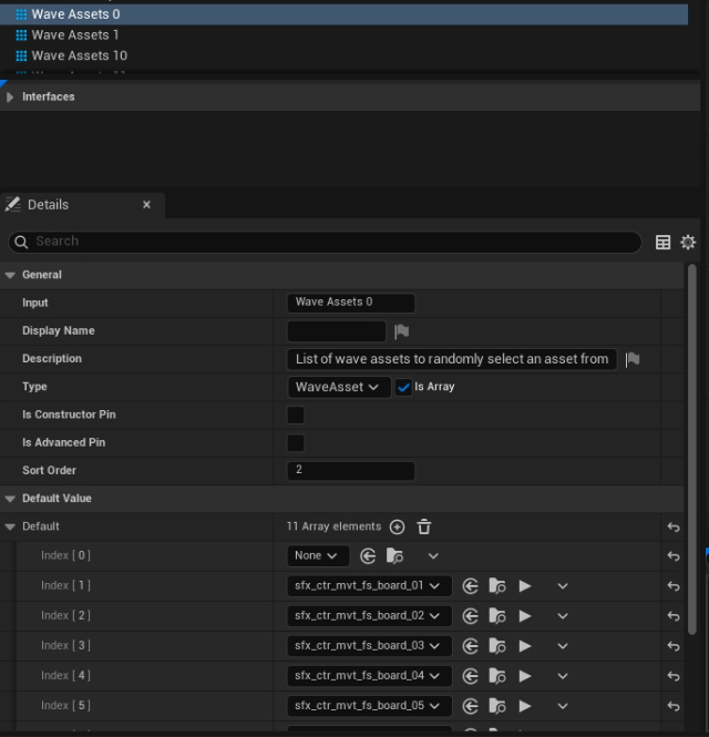 For example, let's say your project has surfaces of wood, stone and metal in that order. You would set that up as wave assets 1 having the wood assets, wave assets 2 having the stone assets and wave assets 3 having the metal assets. Finally, you would need to add the default sounds to use when the surface has none of these 3 materials (imagine the level designer just added a new sand environment). These default sounds would be in wave assets 0 and you could use the wood assets for example. This means that whenever we trigger the notify on an unknown surface, we would hear the wood assets.