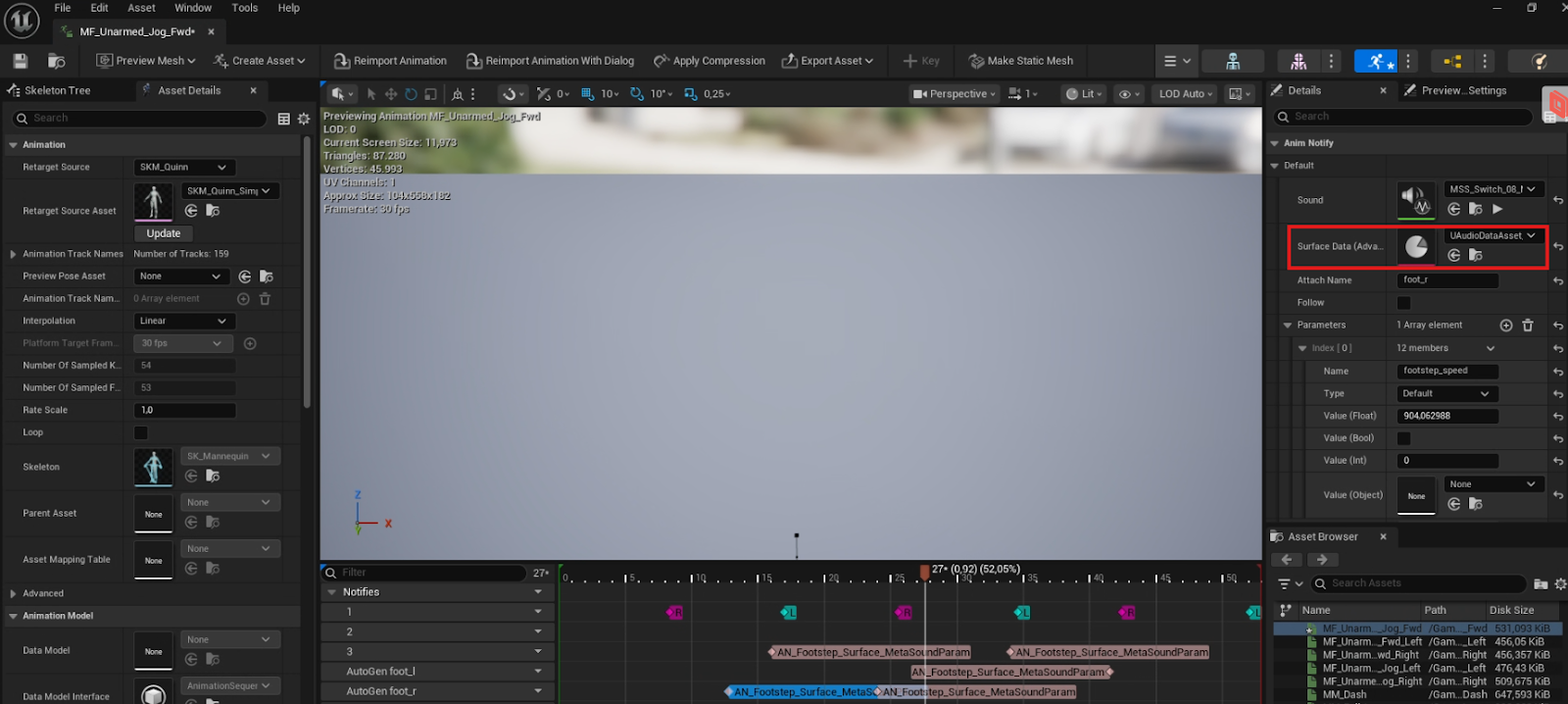 Make sure to set the sound, the follow, the attach name and the parameters for the AN_Footstep_Surface_MetaSoundParam notify. It should look like the following screenshot at the end: