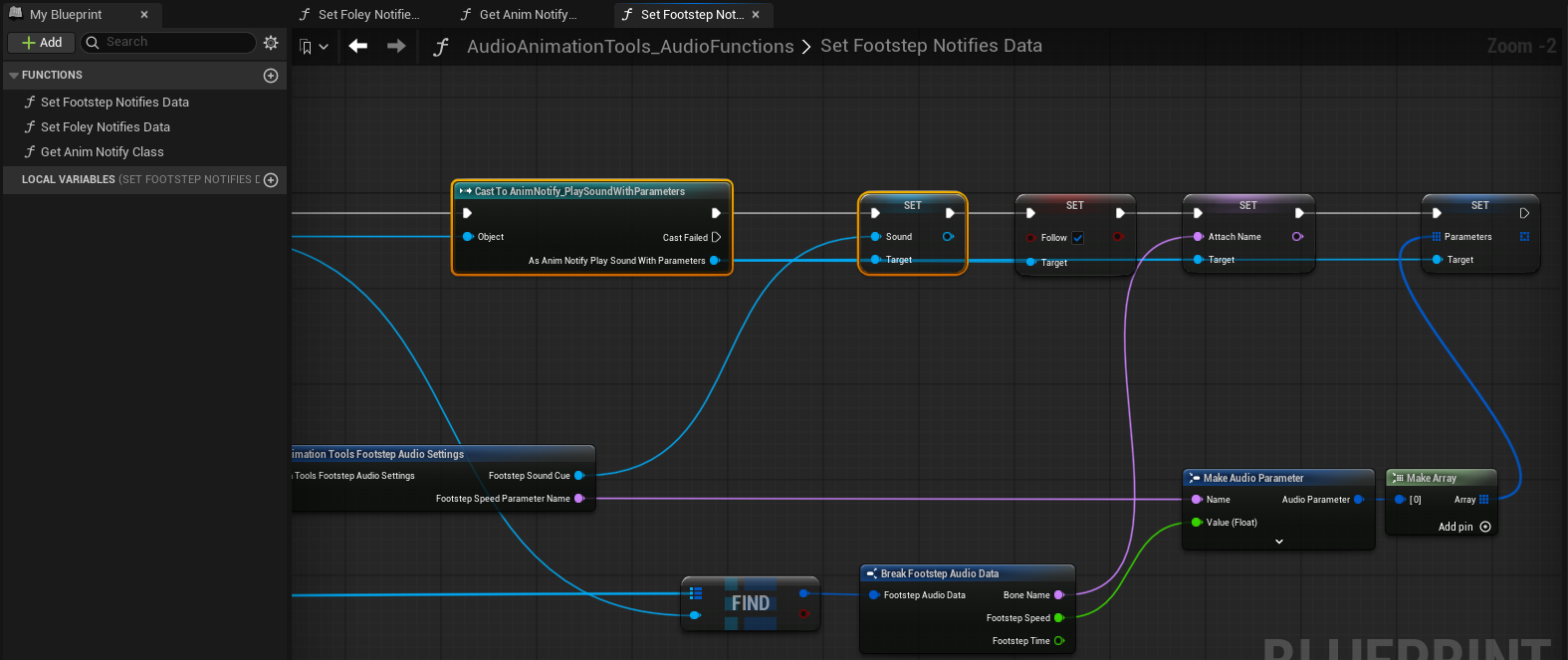 Additionally, make sure to replace the animation notify cast in the Set Footstep Notifies Data function of this same blueprint.